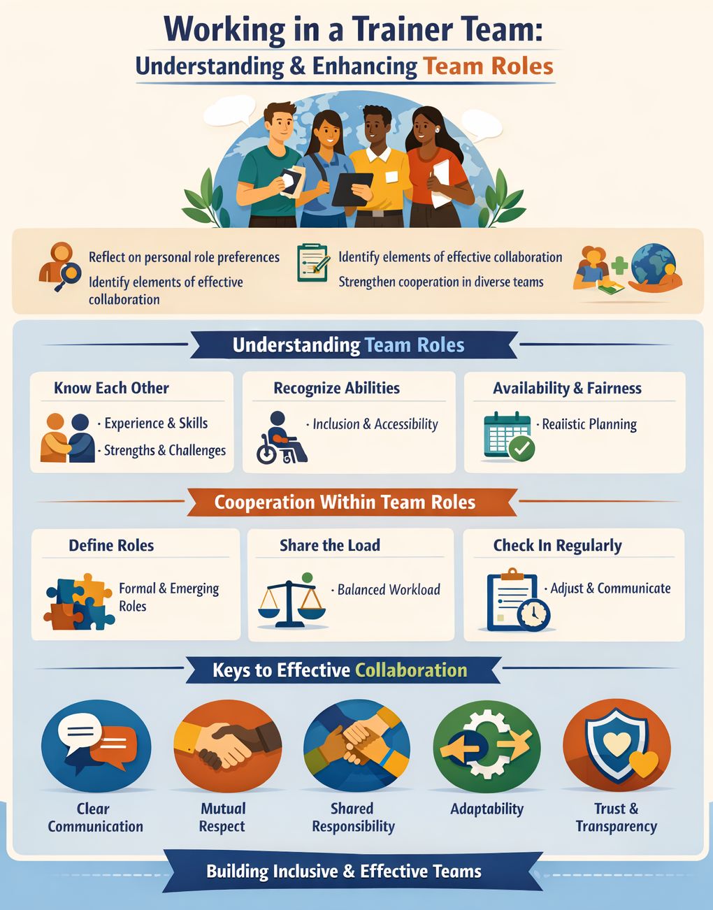 Defining needed roles is key to effective cooperation. Teams should also consider informal or emerging responsibilities and ensure roles complement each other. Fair distribution of tasks and workload builds transparency, trust, and shared responsibility. Regular check-ins help keep expectations clear, ensure roles remain manageable, and allow adjustments when needed. You can find more about teams in T-Kit 6: Training Essentials (PDF) and The right team composition - nice overviewing article about team composition (PDF).